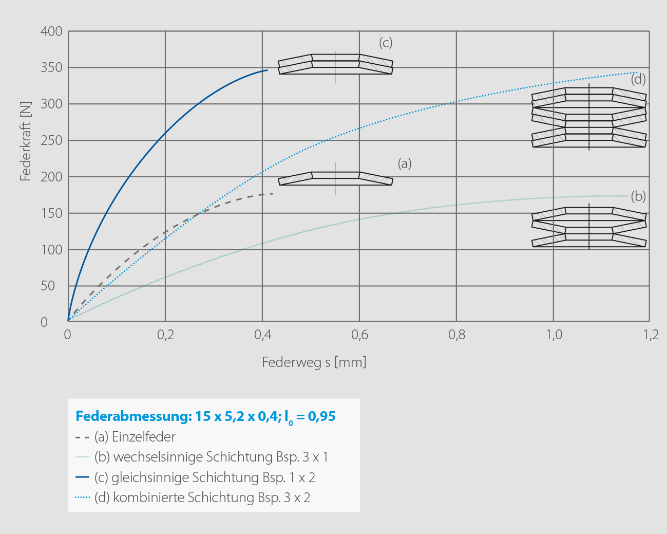 - Bei gleichsinniger Anordnung addieren sich die Federkräfte bei gleichbleibendem Federweg (c).