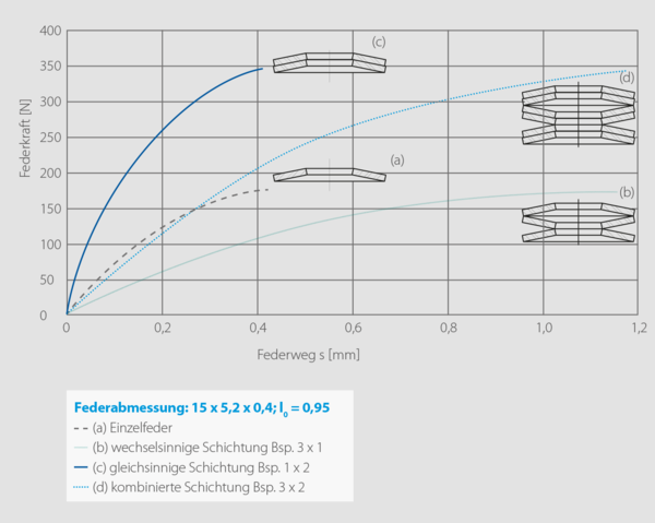 Werden Tellerfedern unterschiedlicher Dicke in geeigneter Weise angeordnet, können sogar progressive Kennlinien realisiert werden.