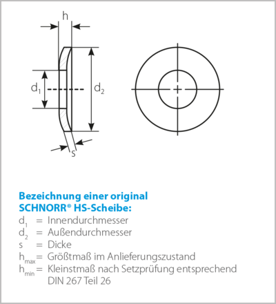 | Artikelnummer | Oberfläche | Nennmaß [mm] | D2 [mm] | D1 [mm] | s [mm] | hmin [mm] | hmax [mm] | Gewicht je 1000 Stück [kg] | |