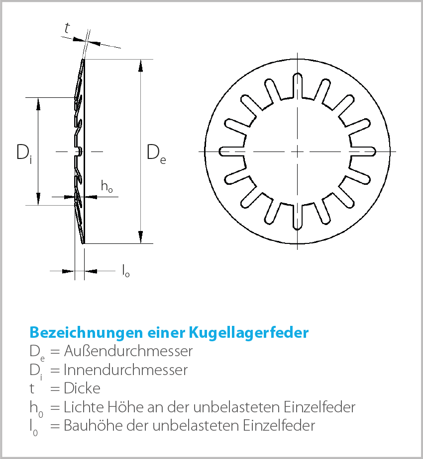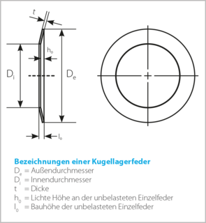 Kugellagerfedern besitzen aufgrund des vorgegebenen Einbauraums von Kugellagern funktionsbedingt eine kleinere Flanke (Verhältnis De/Di) als Standard Tellerfedern.