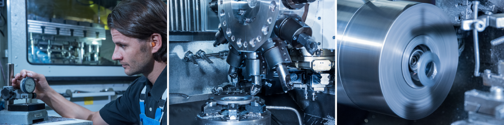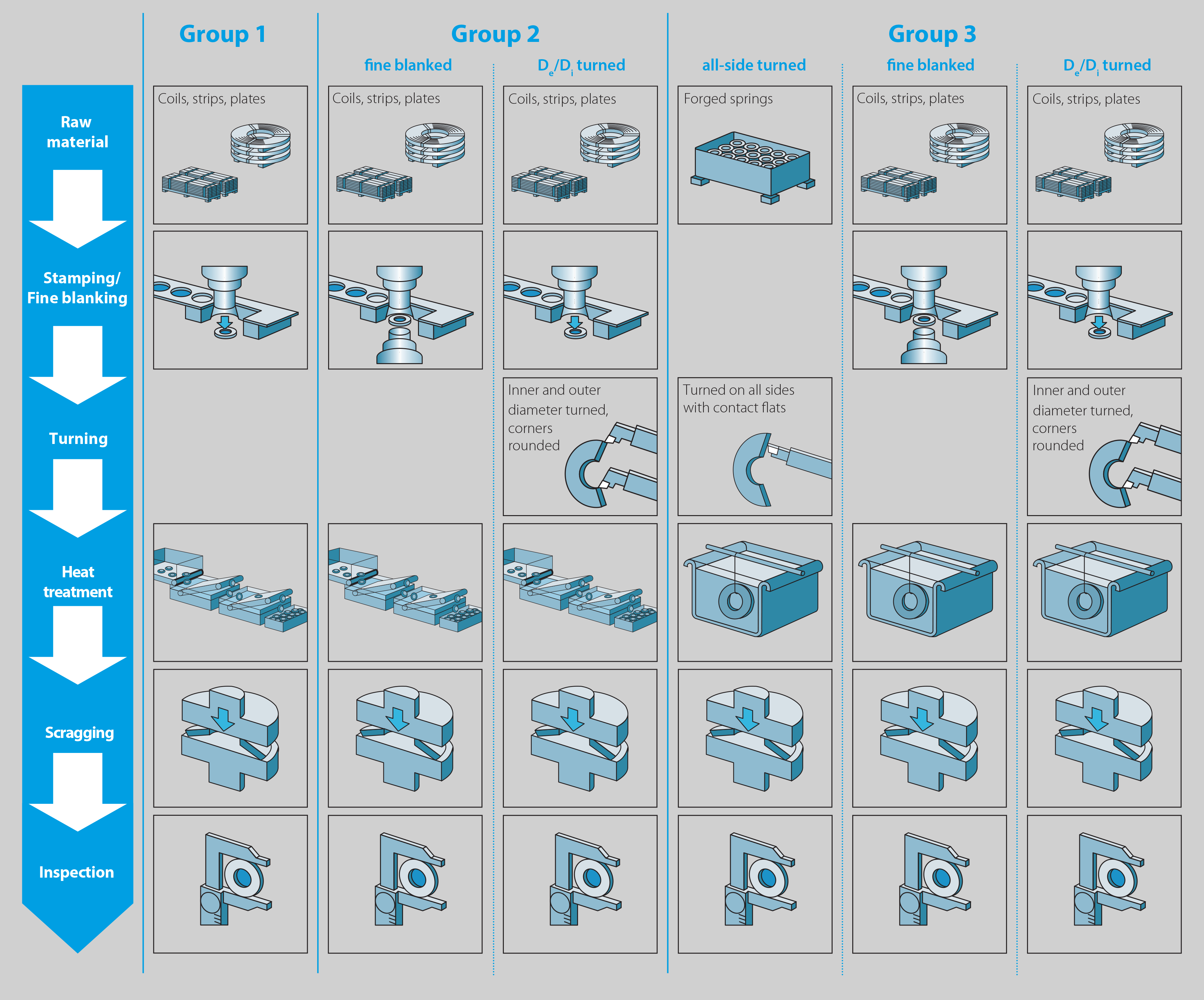 The large dimensional range in which disc springs are made requires different production methods. The methods employed range from simple stamping and stamping with extra machining to hot forged and rolled rings, which are turned or ground to obtain their final shape.