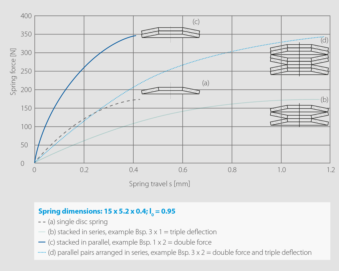 - Due to the almost unlimited number of possible combinations of individual disc springs, the characteristic curve and the column length can be further varied within additional limits.