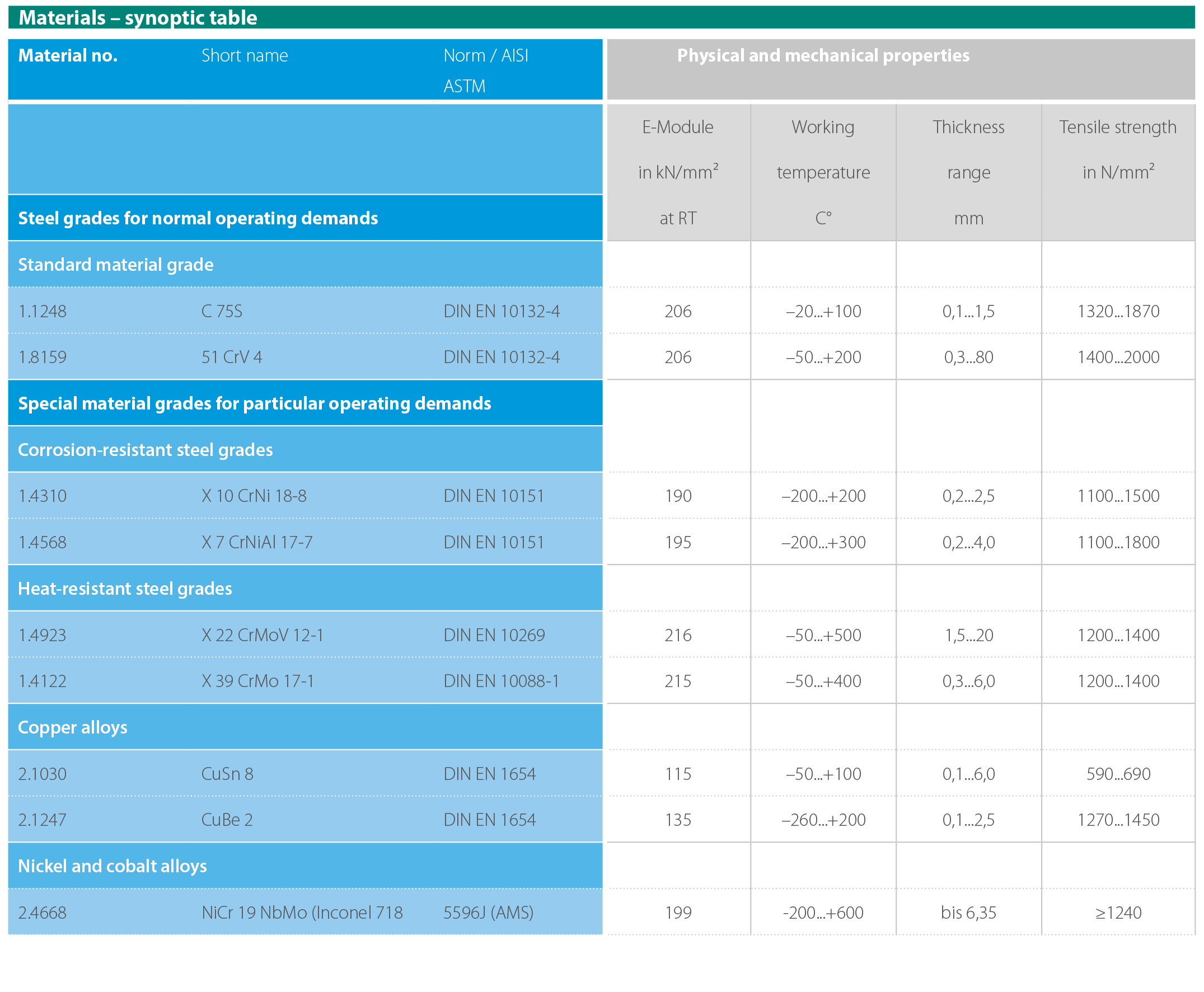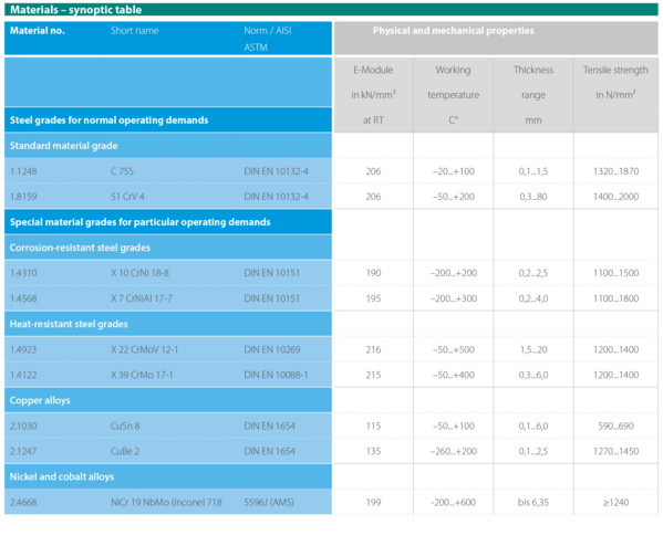 With regard to the maximum working temperatures listed it must be taken into consideration that the setting height of the springs depends on the height of the tensions occurring and on the operating time on temperature. Furthermore, it has to be taken into consideration that with increasing temperature of the elasticity module of the material the strength diminishes. The operating temperature and thickness ranges can serve as reference values only. With heat-resistant steel grades, heat treatment and hardness deviate from the information given in the mentioned standards.