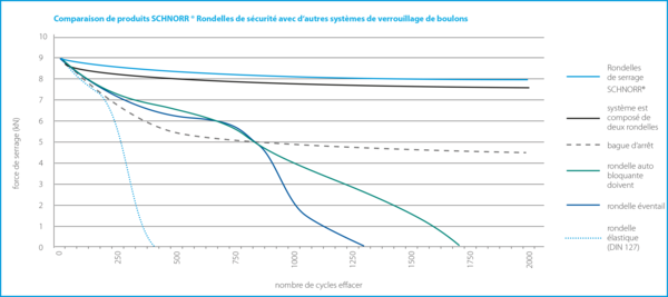 - Le test montre un effet de sécurité supérieur clair de la rondelle de sécurité SCHNORR® d’origine par rapport à la force de tension préalable résiduelle et au nombre des changements de charge par rapport aux bagues d’éclatement, rondelles de blocage, rondelles nervurées et rondelles ressort (DIN 137 B).