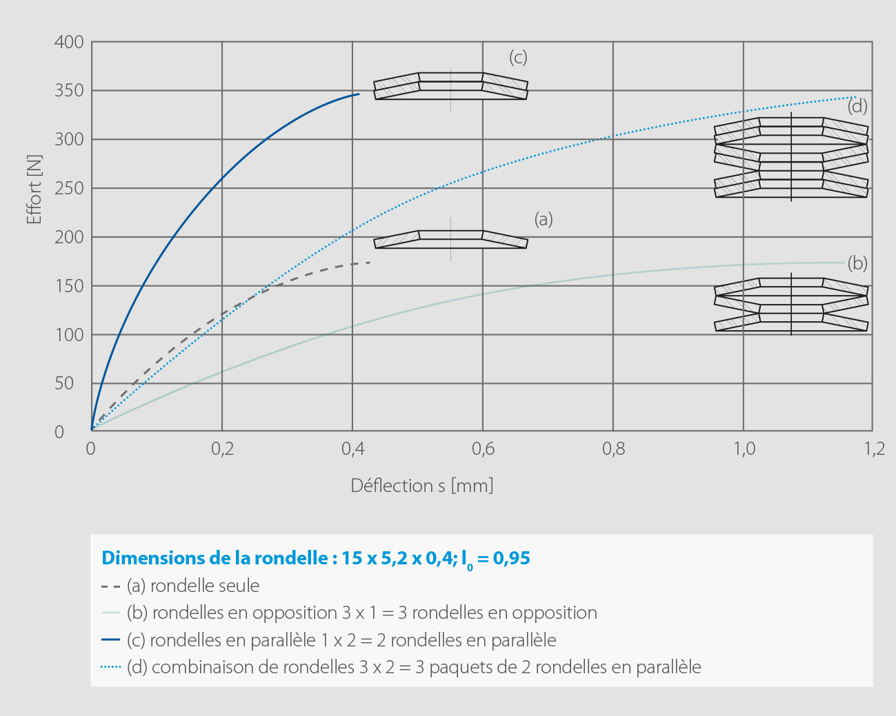 - Dans le cas où les rondelles sont disposées en opposition, alors la déflection s’additionne en conservant un même effort (b).