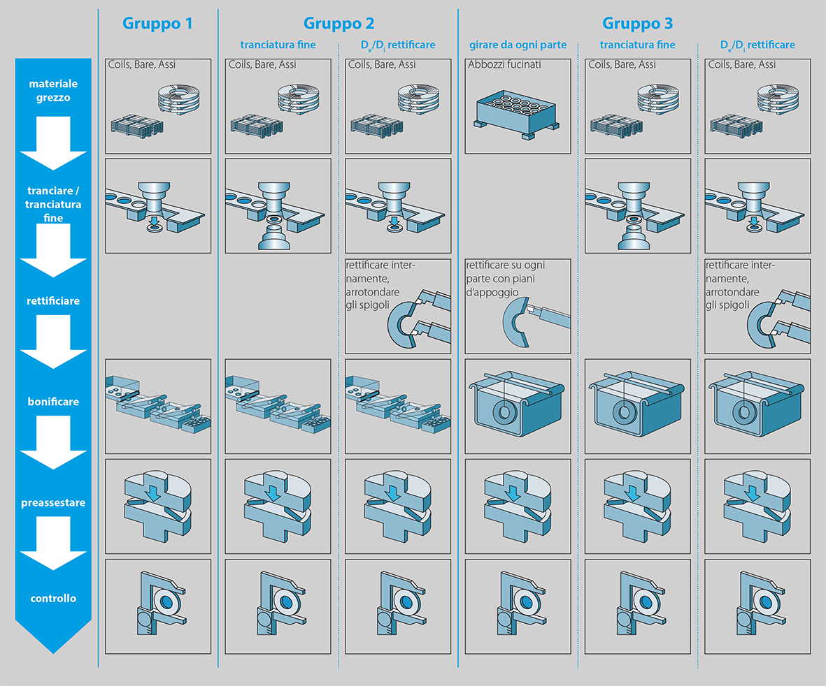 Anche eventuali dimensioni speciali vengono attribuite a uno dei tre gruppi, purché sussista una concreta possibilità di realizzare il pezzo e qualora non sia stata concordata una modalità produttiva diversa. La seguente rappresentazione indica in modo schematico i diversi processi produttivi dei tre gruppi.