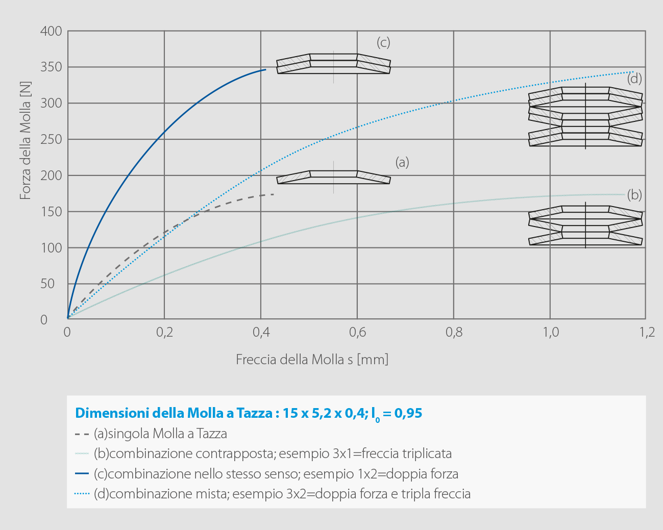 - In caso di accoppiamento delle Molle a Tazza nello stesso senso, si raddoppiano le forze con freccia costante.